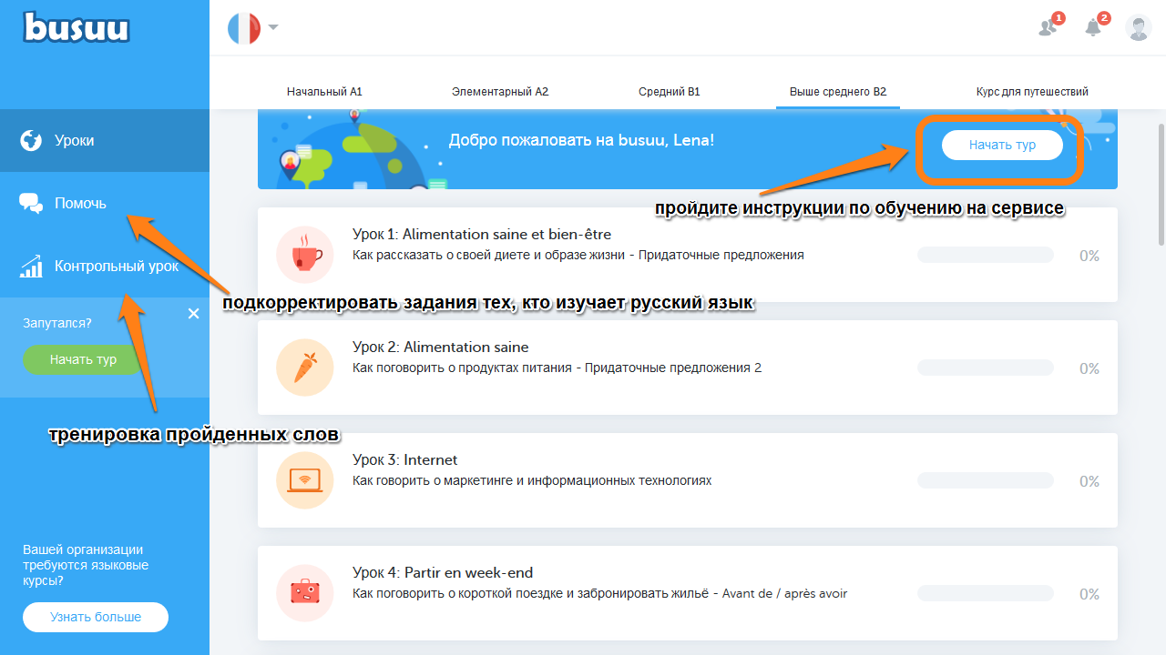 - На синей панели слева помимо опции уроков у вас есть раздел «помочь»: вы можете оставлять свои письменные задания, а носители языка их проверят, исправив ошибки.