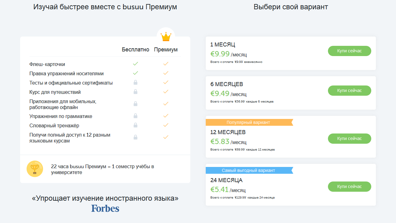 Тарифы на абонементы busuu и преимущества участия Premium.