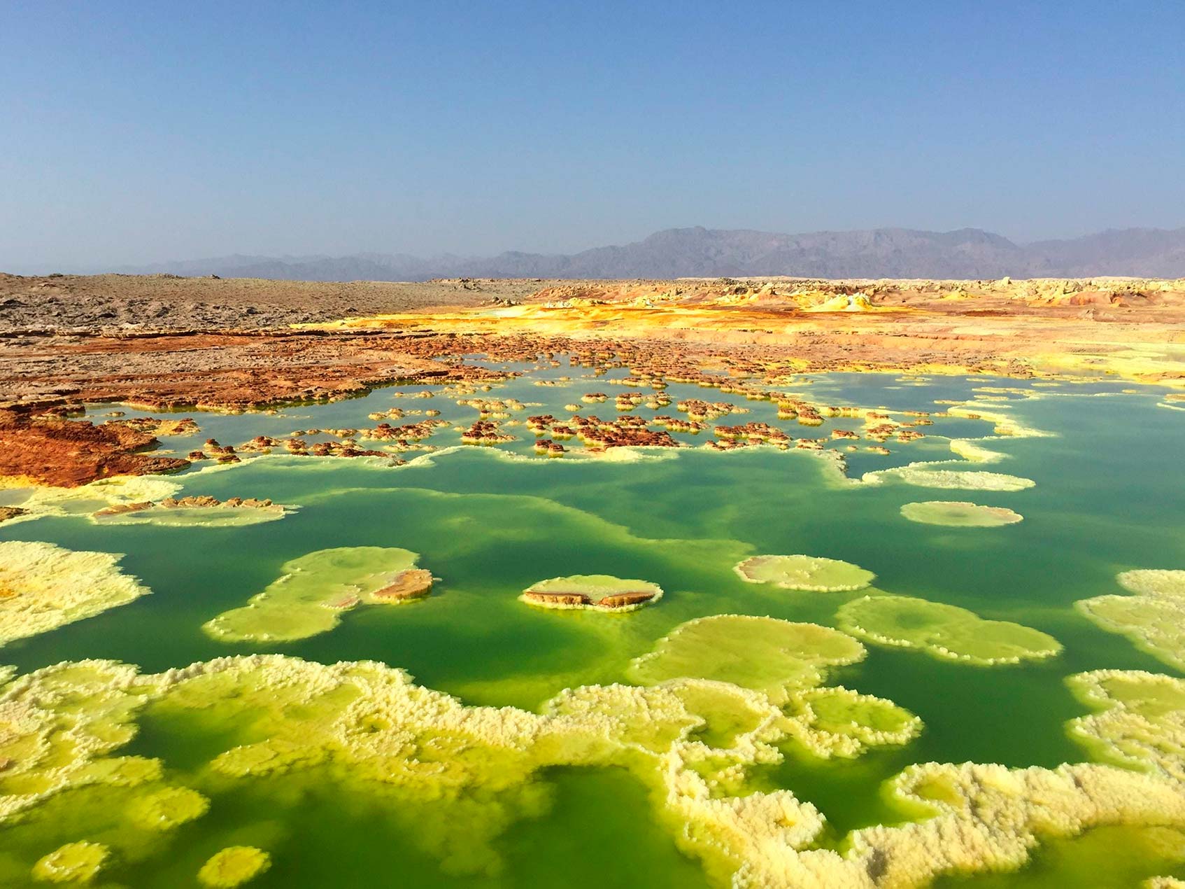 Еще одна идея для трипа на несколько дней — посещение уникального природного заповедника, солевой пустыни кислотных оттенков под названием Данакильская впадина, которая находится неподалеку от границы с Эритреей. Это самое жаркое место Эфиопии: здесь почти никогда не идут дожди, а столбик термометра порой поднимается до отметки 70 градусов по Цельсию. Приезжать сюда нужно обязательно с гидом, ведь место это достаточно опасное — в пустыне есть спящие и действующие вулканы, а некоторые водоемы и вовсе испускают ядовитые испарения.