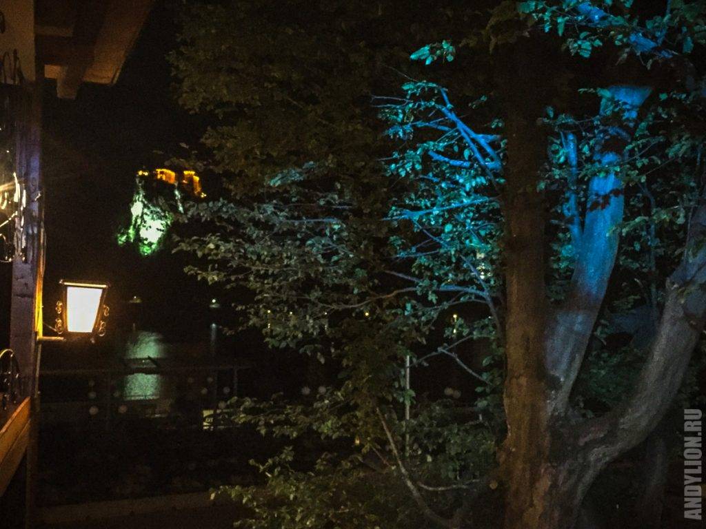 После этого отправились прогуляться по ночному Бледу к озеру. До озера дошли, увидели на противоположном берегу Бледский замок, красиво подсвеченный искусственными огнями и луной. Получилась довольно милая и романтичная прогулка. Напоследок завернули в прибрежный паб, едва ли не единственный, который еще работал в это время. Вот из него и сделана следующая фотография, на которой, если очень постараться, можно увидеть и замок, и озеро.