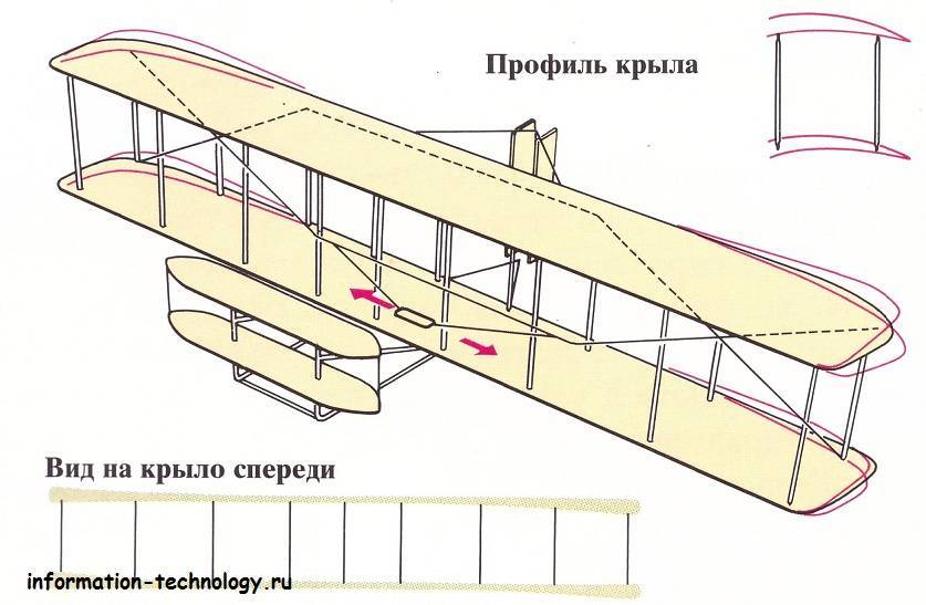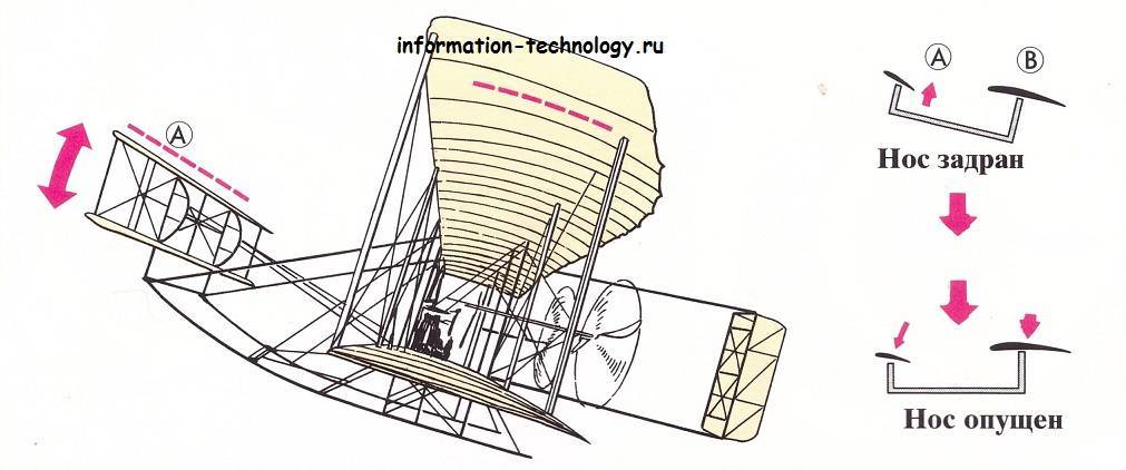 Перед крыльями были укреплены сдвоенные рули высоты. С их помощью осуществлялся набор высоты и снижение. Подобная конструкция, известная ныне под названием канард, делает устойчивым полет самолета на малых скоростях. В отличие от современных воздушных лайнеров, у которых рули высоты расположены в кормовой части, у “Флайера” они были спереди. И если нос его задирался слишком высоко, перед крыльями выставлялись рули высоты, которые плавно опускали нос книзу и возвращали самолету равновесие.