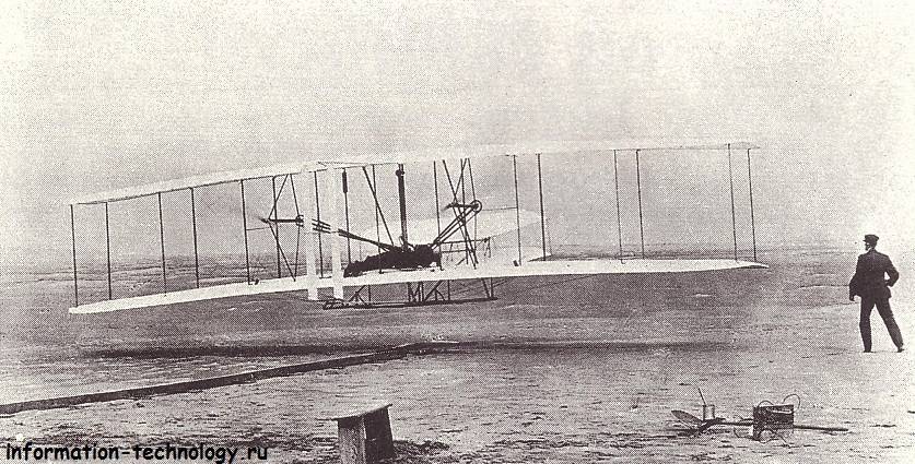 Первый воздушный полет, в котором пилотом был Орвил, продолжался 12 секунд и имел протяженность 120 футов. “Флайер” братьев Райт с размахом крыла 40 футов приводился в движение легким четырехцилиндровым двигателем, работающим на бензине. Этот двигатель мощностью 12 лошадиных сил вращал через цепной привод воздушные винты самолета. Одной из главных особенностей “Флайера” были гибкие концы крыльев, которые можно было сгибать для управления самолетом.