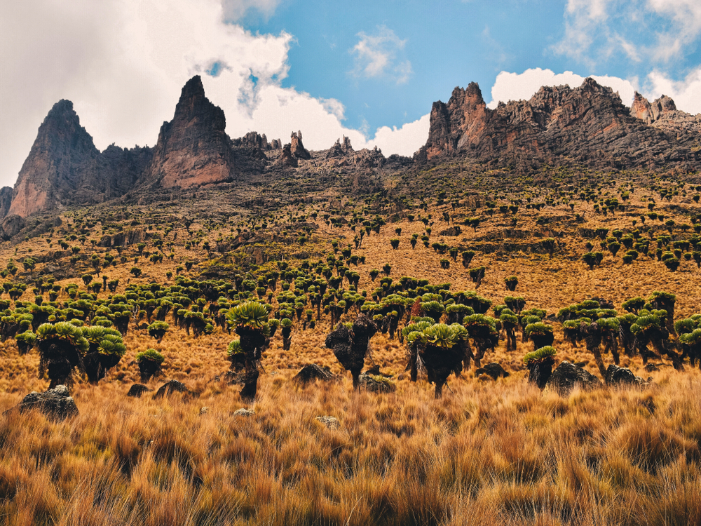 Удивительные скальные образования на Пути Сиримона, гора Кения. Национальный парк Гора Кения открылся для посетителей в 1949 году. На территории парка расположено множество озер, ледников и природных минеральных источников. На горе Кения есть 4 основных пеших маршрута, среди них – Путь Сиримон (Sirimon Route, север) и Кольцевая тропа. Треки начинаются на уровне 2-3 тыс. м и позволяют увидеть пейзажи джунглей, альпийских лугов, а также тундру, камни и льды.