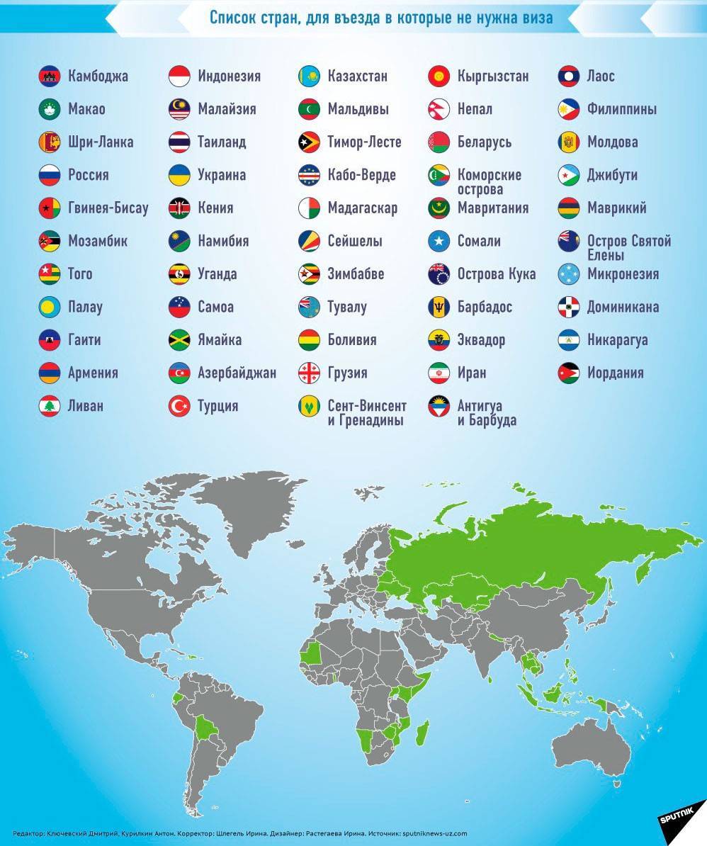 В безвизовом или упрощенном порядке узбеки вправе путешествовать по территории 54 держав мира. Это государства Азии, Европы, Америки, Африки и Океании.