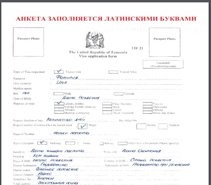 - Зайти на сайт посольства http://www.tanzania.ru/ru/visa, скачать и заполнить визовую анкету. Также бланк заявления можно взять в дипломатическом ведомстве. Информация вносится на английском (на компьютере либо от руки).
