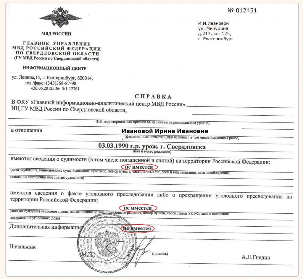 - справка об отсутствии судимости – выдаётся в МВД по месту жительства в РФ, срок действия не более 3 месяцев;