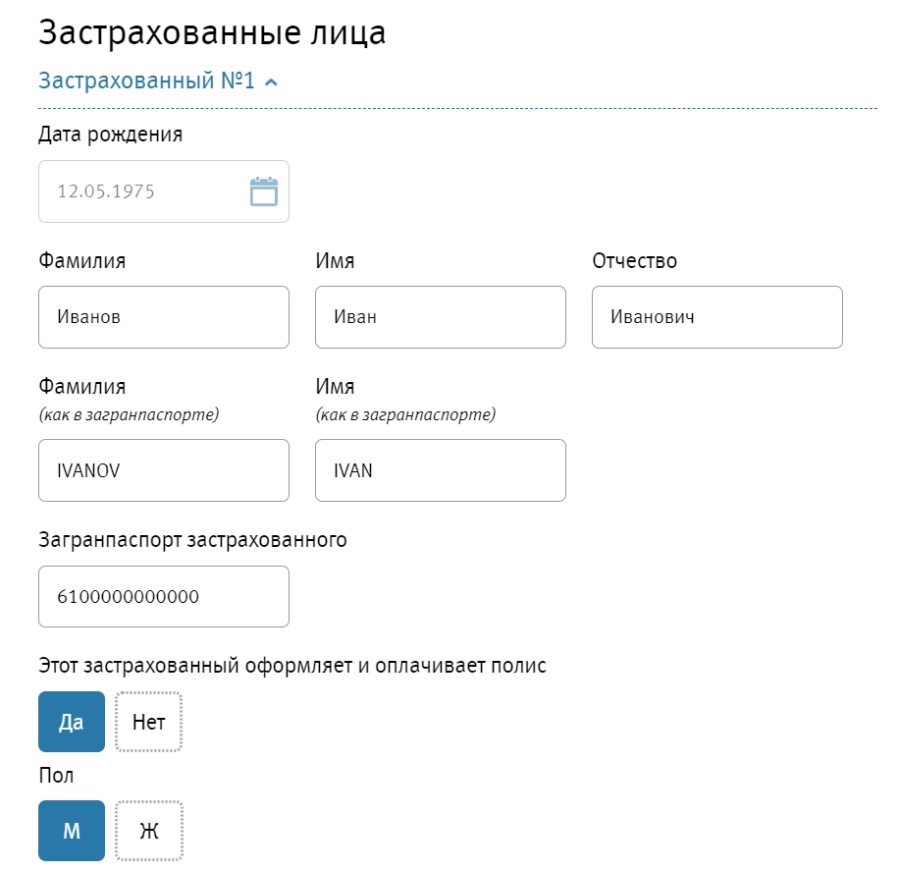Справа можно увидеть таблицу с итоговой суммой за все услуги. После этого откроется окно, в котором необходимо указать личную информацию (ФИО, дату рождения, пол) и данные загранпаспорта каждого застрахованного лица. В следующей вкладке вписать имя, фамилию, отчество, дату рождения страхователя, его адрес электронной почты и и-мейл, на который будет выслан полис.