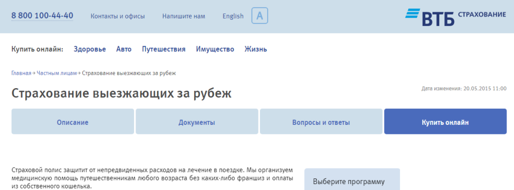 Можно отправиться в отделение компании (перечень и расположение офисов имеется на сайте), написать заявление и получить документ. Но гораздо проще и быстрее оформить заявку на официальном сайте ВТБ страхование. Для этого следует перейти на вкладку «Страхование выезжающих за рубеж», изучить описание программы, документацию После этого – в окно «Купить онлайн».