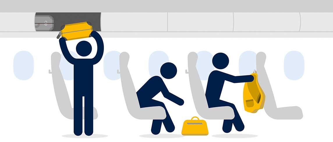 Размещая ручную кладь и другие предметы, которые берете с собой на борт, убедитесь, что они не загромождают проходы и аварийные выходы в соответствии с инструкциями экипажа.