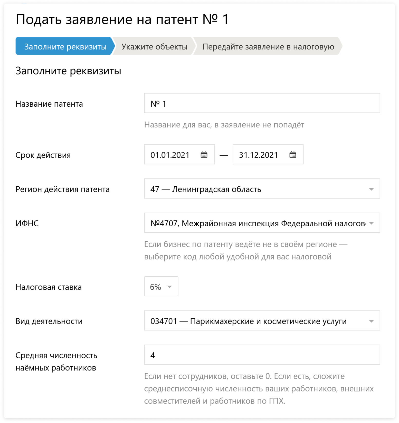 Действие патента может начинаться с любой даты, но мы рекомендуем указать первое число месяца. Многие налоговые не принимают заявление с другой датой.