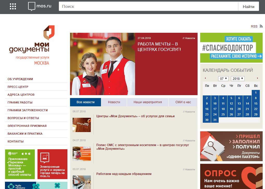 И еще один возможный вариант – обратиться в любое отделение МФЦ. Преимущество способа в том, что заявитель может записаться на любое удобное время по телефону или онлайн на сайте МФЦ. Для этого нужно найти сайт центра, который обслуживает именно ваш регион, поскольку единого всероссийского портала не существует. Например, так выглядит сайт МФЦ г. Москвы.