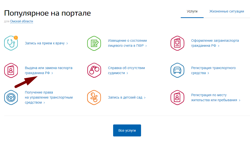 - Выбрать раздел “Паспорта, регистрации, визы” и найти необходимую функцию (замена).