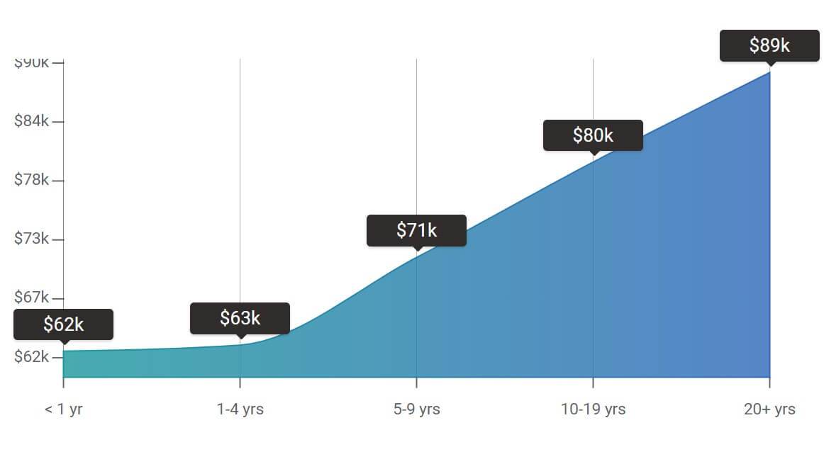 Исследование показывает, что если у вас опыт работы 5-9 лет, то вы сможете зарабатывать в среднем около 70 тысяч долларов в год. На графике рост зарплаты выглядит следующим образом:
