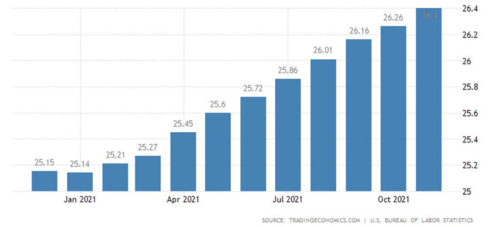 Выше – это всё сухая статистика, на практике люди получают в разных штатах очень по-разному. Поэтому, говоря о прожиточном минимуме в США и МРОТ, нельзя не затронуть средние зарплаты. На данный момент средняя ставка за 1 час работы составляет 26.4 доллара. За 2021 год реальная ставка за 1 час работы существенно выросла, можно посмотреть в динамике: